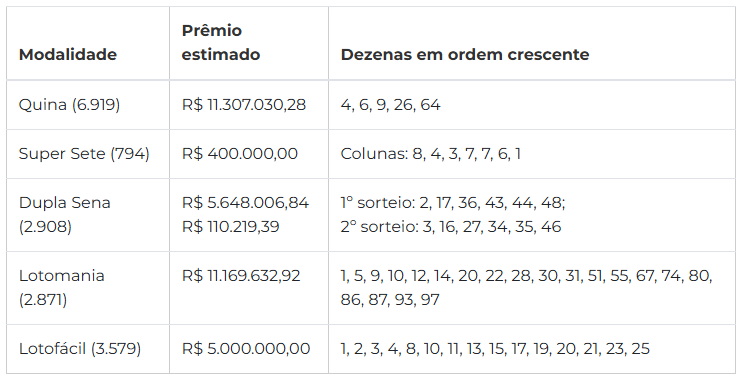 O prêmio principal, estimado em R$ 5 milhões, dividiu-se entre cinco apostas vencedoras em diferentes regiões do país. Além de Campo Grande, apostas de Curionópolis (PA), Rio de Janeiro (RJ), Natal (RN) e Bertioga (SP) também recebem o prêmio de R$ 768.413,77.